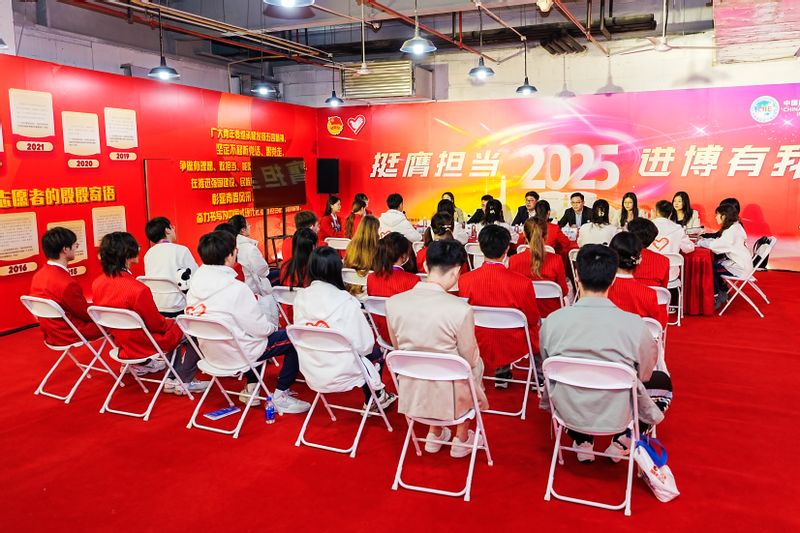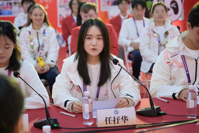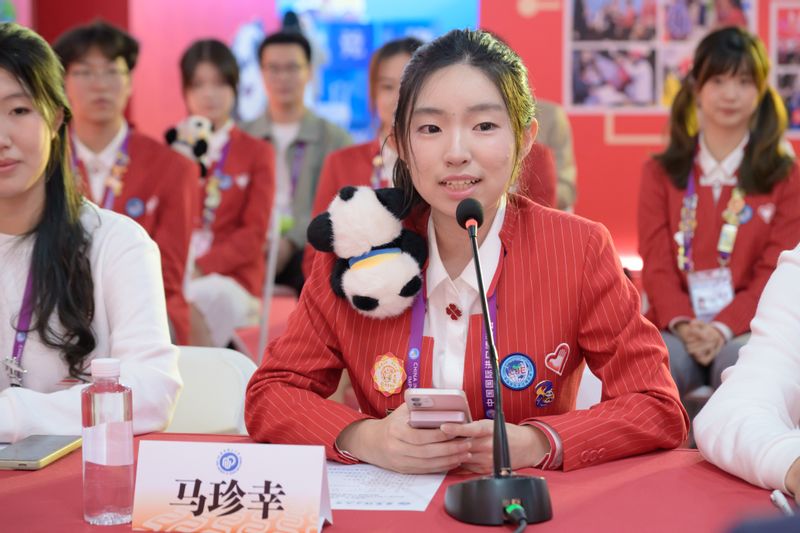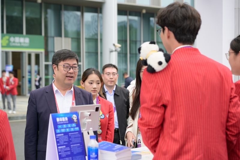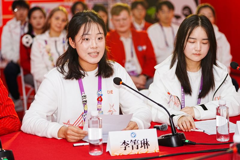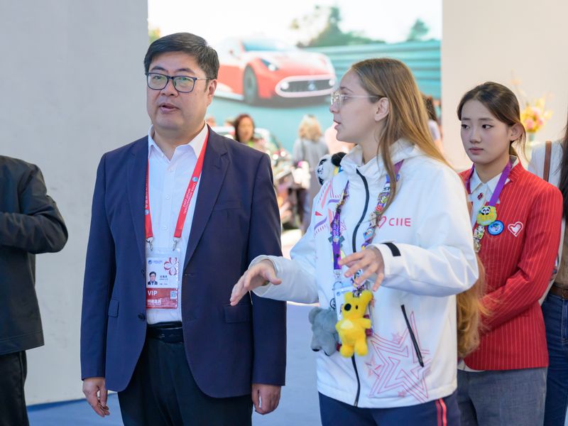 沈海涛一行还走访慰问了在岗服务的“小叶子”们,近距离与“小叶子”们交流互动。新闻中心志愿者、商学院2023级本科生朱良琳介绍了媒体岗位的日常工作;咨询处志愿者、信息科学与工程学院2023级本科生唐嘉怿及法学院2024级研究生夏宁宇展现了热情周到、专业有序的服务风采;汽车展区志愿者、法学院2024级研究生牛嘉悦,社会与公共管理学院2022级本科生王基同及国际教育学院白俄罗斯籍留学生姜笑妍则结合展区特色,介绍了展出的新能源汽车、智能驾驶等领域的前沿技术与展品亮点。